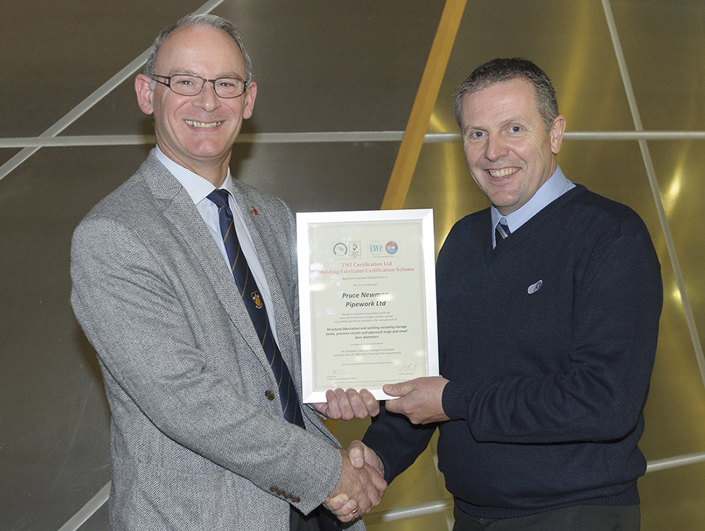 “The TWI CL Factory Production Control certificate was awarded to Pruce Newman following assessment of compliance with EN 1090 and ISO 3834 requirements by our professionally qualified and highly experienced welding engineers. Pruce Newman’s customers can have high confidence that the UKAS-accredited CAESAS and WFCS certificates confirm their competence and capability to manufacture welded products.”